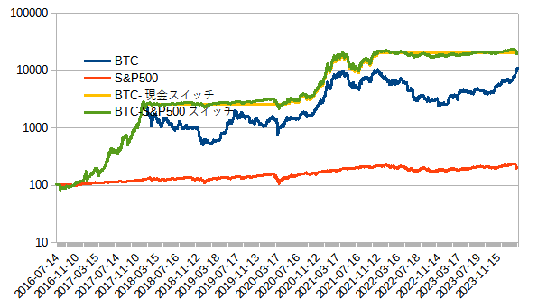 - 半減期の日を始点として、現金 or S&P500を全部ビットコインに変えます