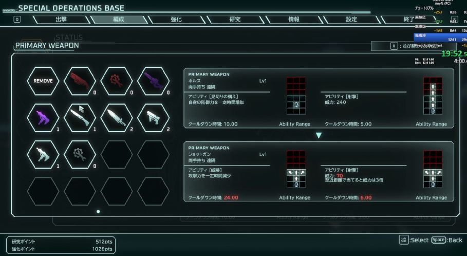 で、最初に書いたバグは、以下の画像みたいな感じで装備を選んでる最中に、「出撃」ボタンを押すと、装備画面の効果が残ってて、「REMOVE」を誤って押してしまって装備無しで出撃する、なんてことが起こる。